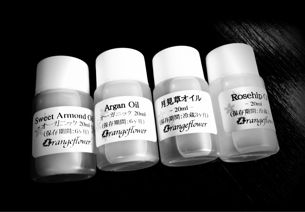 スウィートアーモンドオイル(オーガニック)、アルガンオイル(オーガニック)、月見草オイル、ローズヒップオイルです。